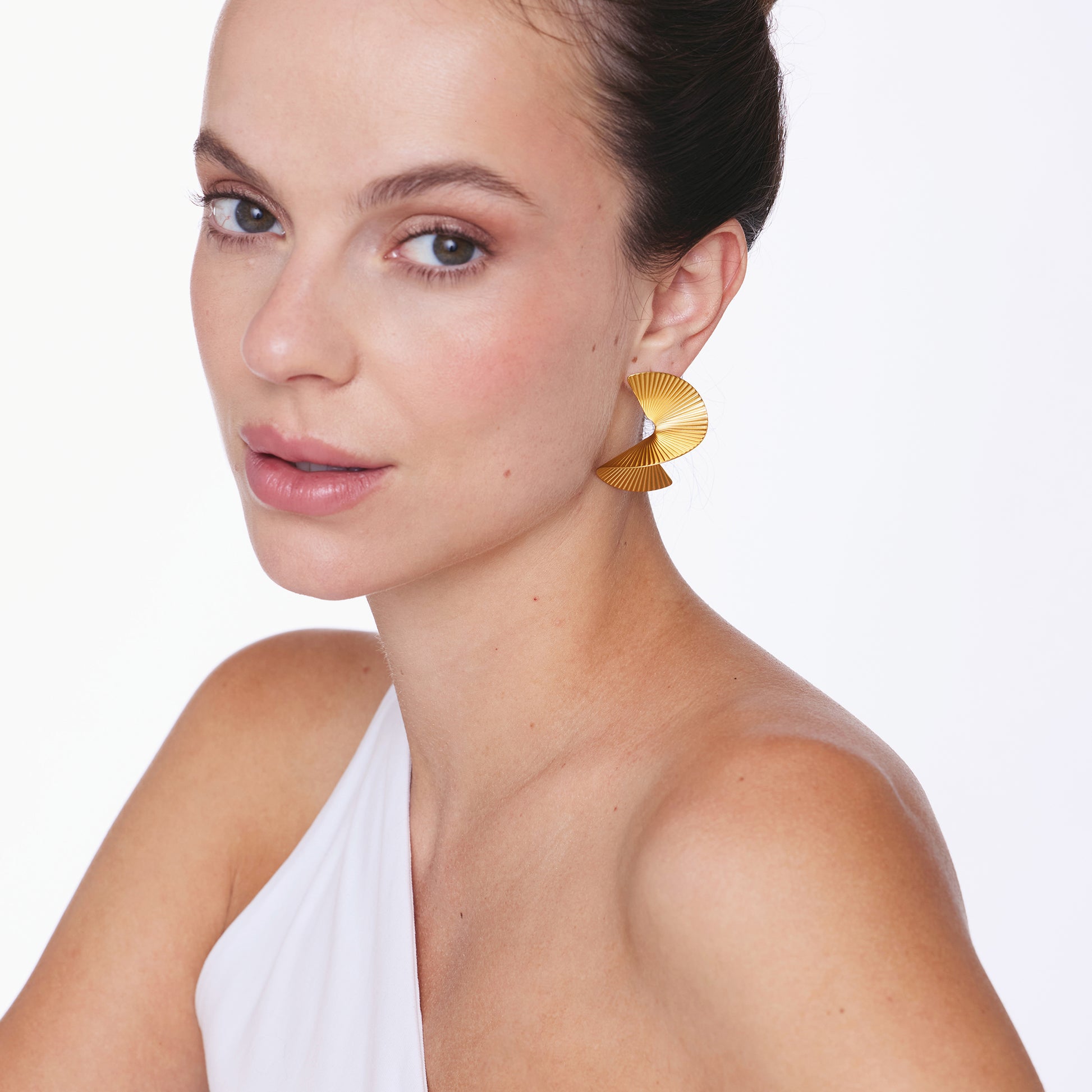Aros dorados grandes con forma irregular en espiral y textura de lineas, livianos.