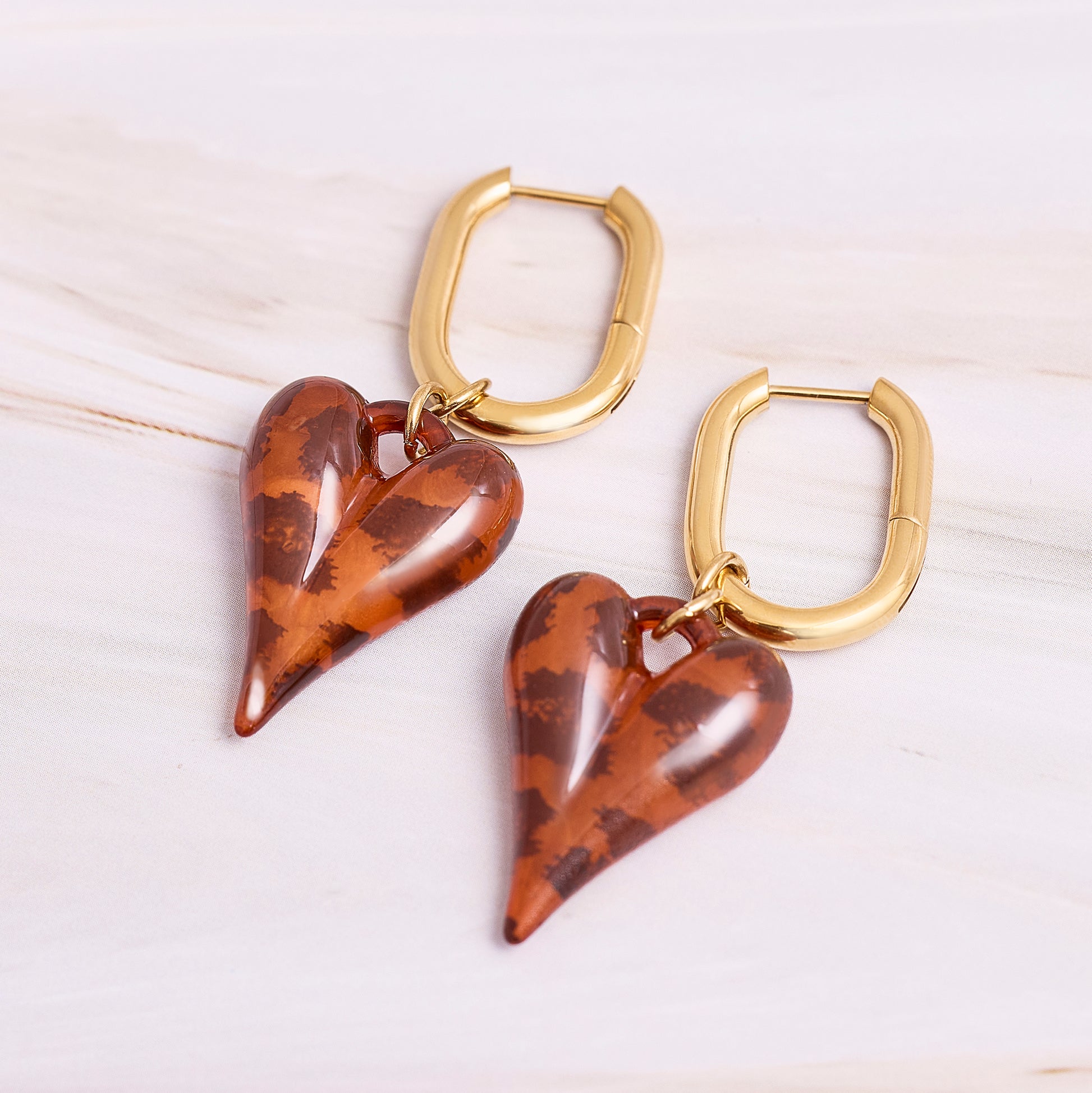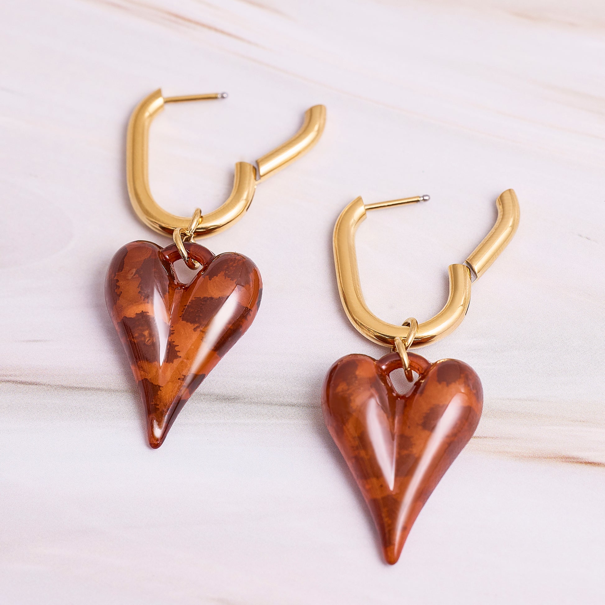 Aros colgantes de argollas cuadradas doradas y detalle de corazón en animal print sutil.