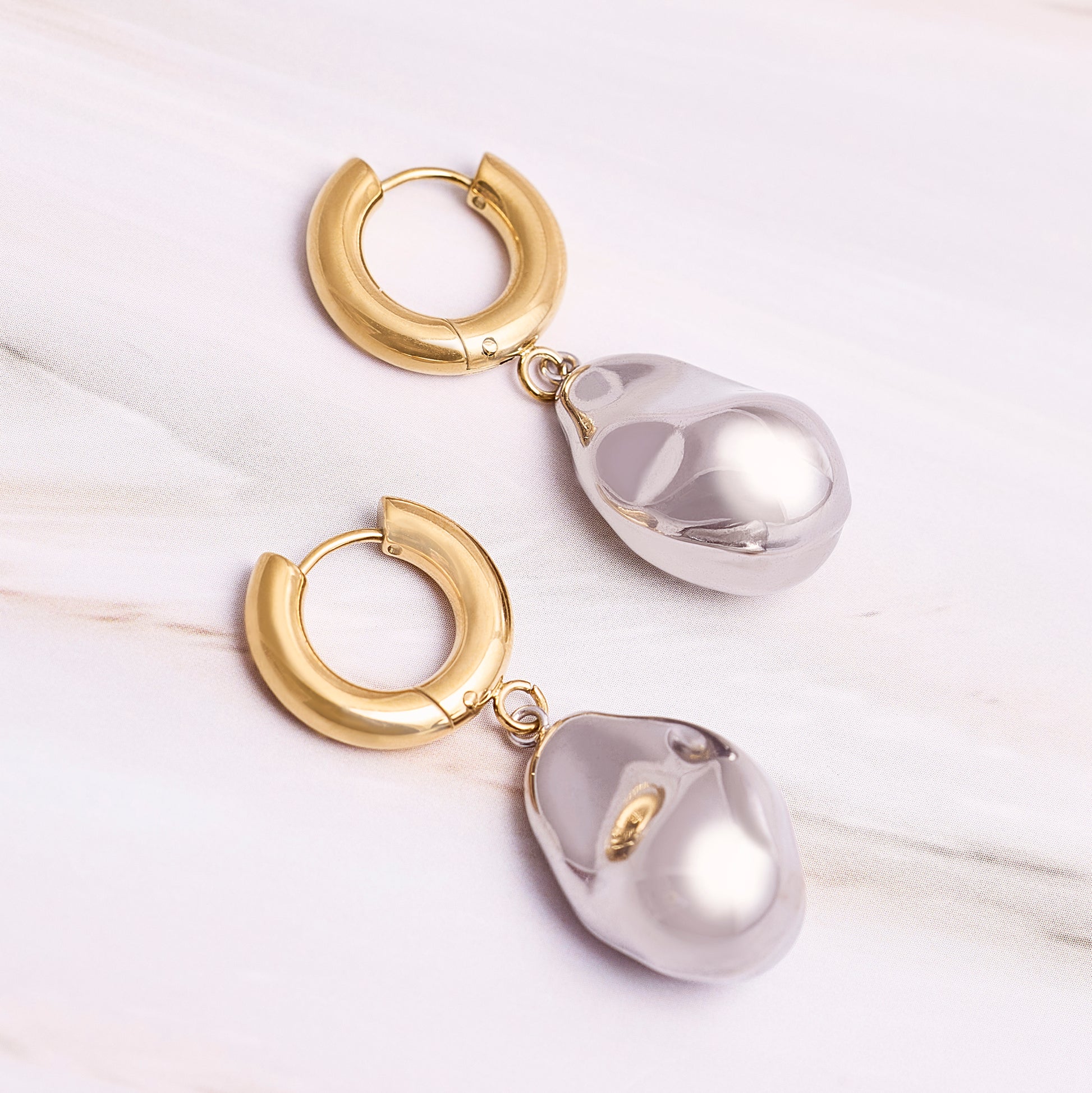 Aros colgantes forma de perla irregular con argollas, bicolor, opción de conjunto con pulsera.
