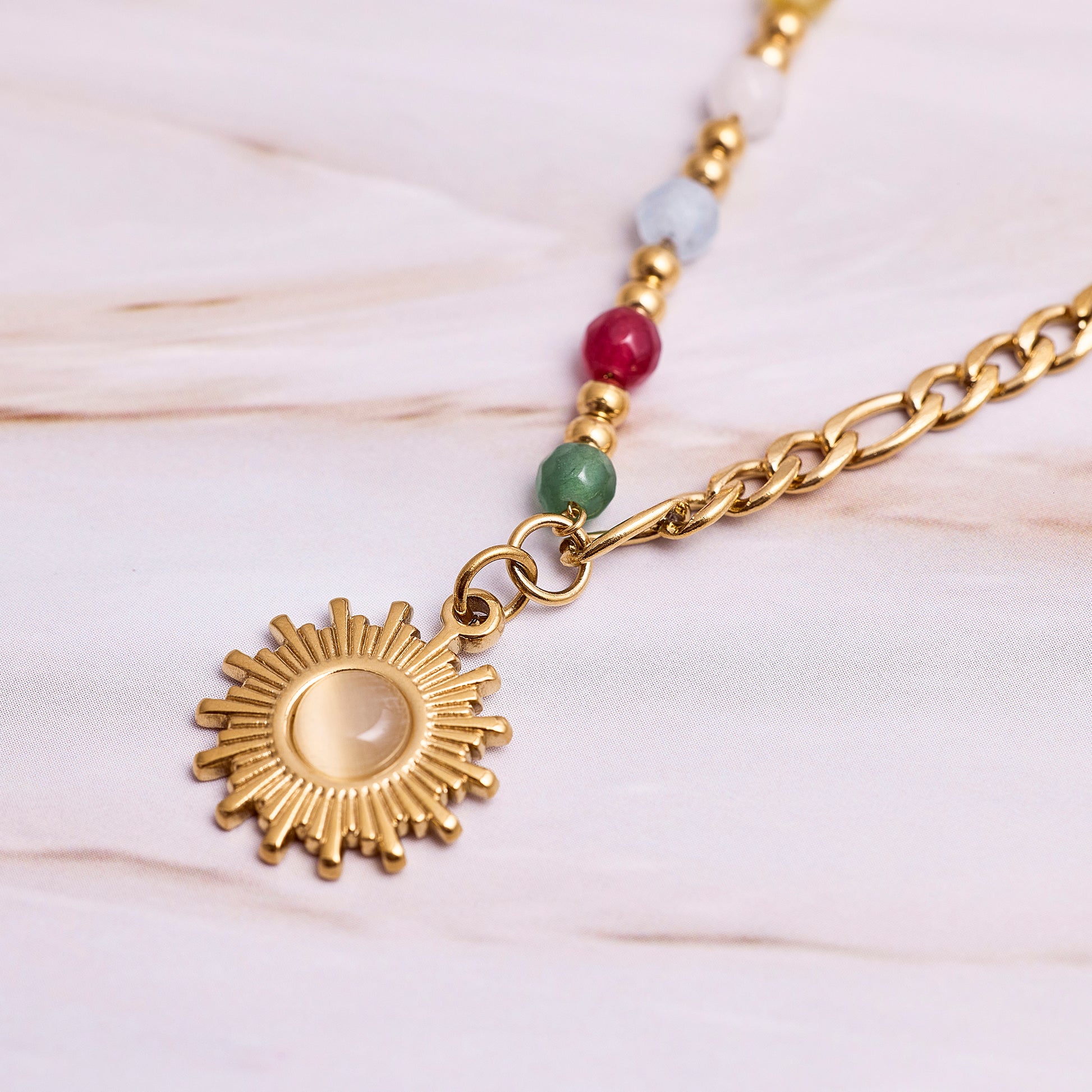 Collar cadena colgante disparejo con sol y opalo, con colores y cadena.