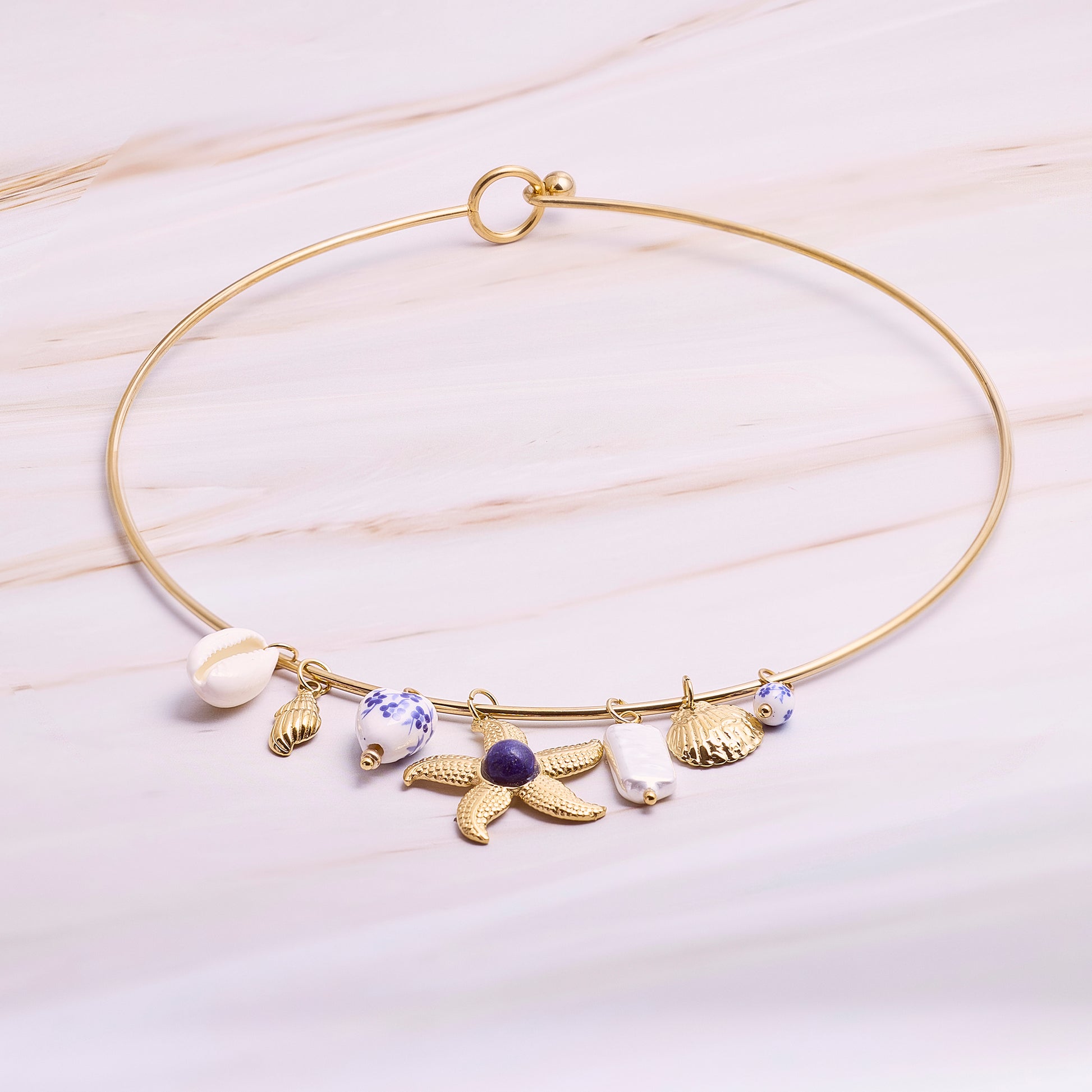 Collar redondo fijo con dijes colgantes marinos inspirado en grecia, con estrella de mar.