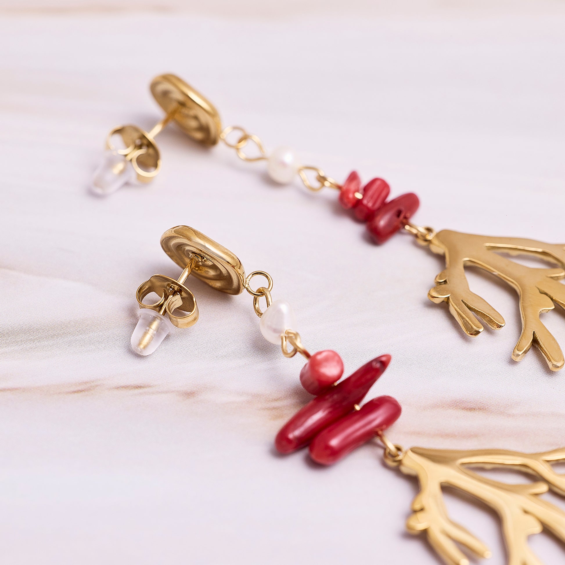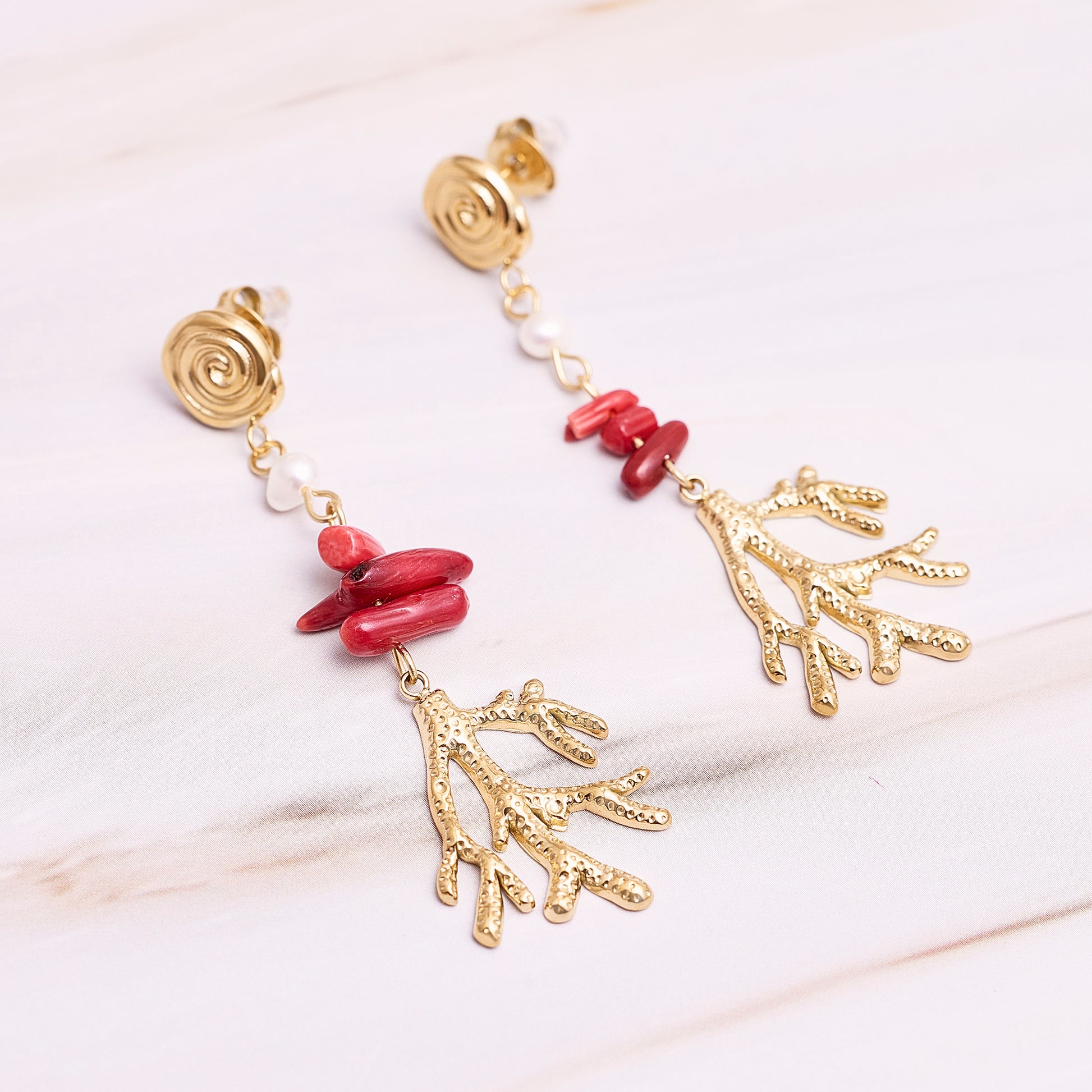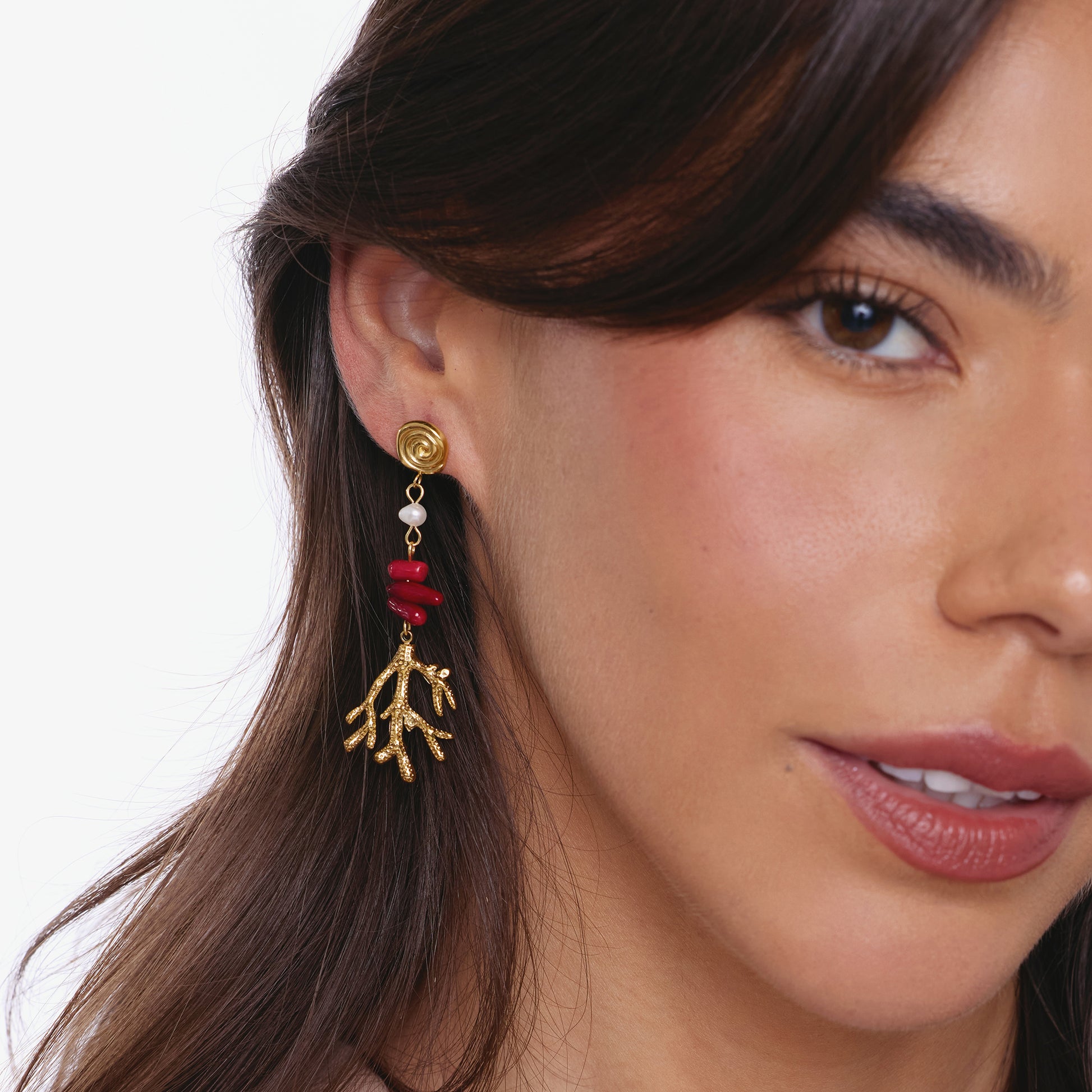 Aros colgantes largos con detalle en piedras rojas y corales dorados con textura.